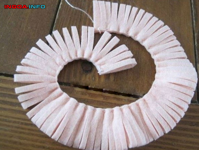 - Cắt vải nỉ màu vàng cỡ 1,5 x 20 cm để làm nụ hoa. Gấp đôi lại và cắt tua rua. Dán kẽm cành vào và cuộn lại