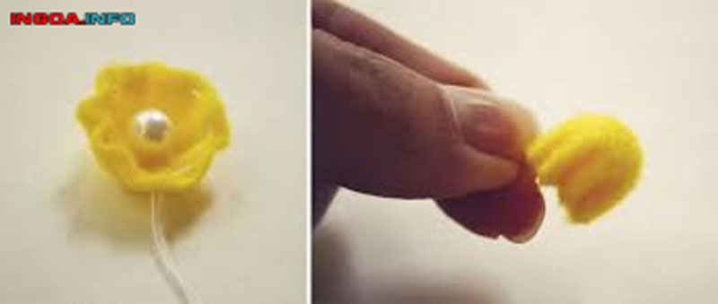- Lấy vải dạ màu vàng rồi cắt thành nụ hoa hình tròn với bán kính 2,5cm. Sau đó, đặt hạt ngọc trai vào trong mảnh vải vừa cắt rồi khâu kín lại để tạo thành nụ hoa.
