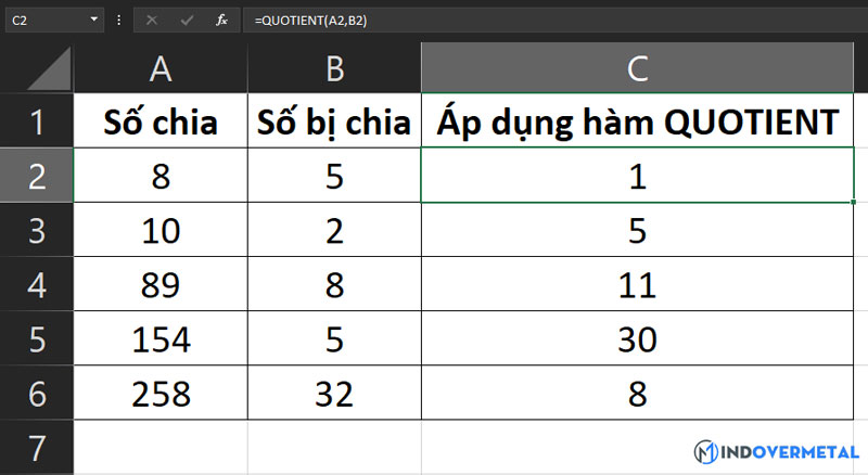 Trong Excel, khi nhắc tới phép chia, ta thường quen thuộc hơn với hàm MOD trả về phần dư. Ngoài ra, Excel cũng cung cấp hàm QUOTIENT đưa ra kết quả phép chia. Để tìm hiểu thêm về hàm QUOTIENT là gì và công dụng của nó trong Excel như thế nào? Hãy cùng Mindovermetal theo dõi tới cuối bài viết để hiểu rõ hơn về hàm này nhé!