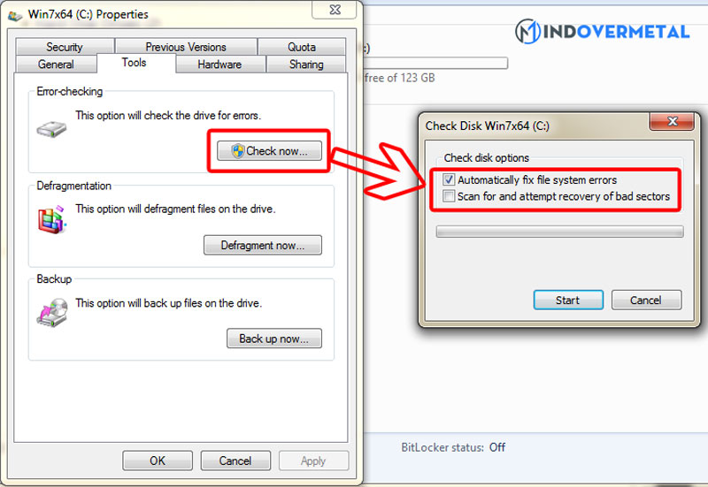 Nhấn chuột phải vào ổ đĩa cần kiểm tra, sau đó chọn thẻ Tools. Lựa chọn Check now phía dưới mục Error-checking và đánh dấu cả 2 tùy chọn, cuối cùng nhấn Start.