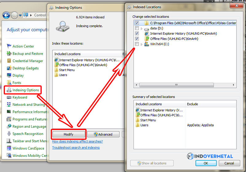 Bạn có thể tìm hiểu các tùy chọn lập chỉ mục ở bên trong Control Panel -> Indexing Options -> Modify button (nếu không thấy thì bạn thay đổi “View by: small icons” trong Control Panel nhé).