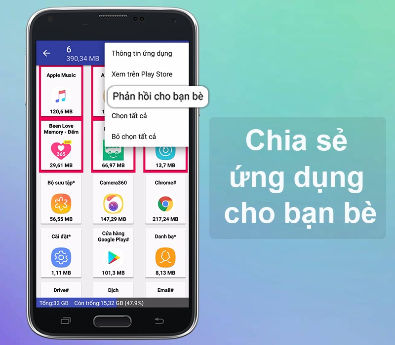 Đến với ứng dụng AppMgr III (App 2 SD), bạn dễ dàng chia sẻ danh sách ứng dụng trên thiết bị với bạn bè thông qua tin nhắn. Bạn có thể chia sẻ những ứng dụng hữu ích đến bạn bè và người thân.
