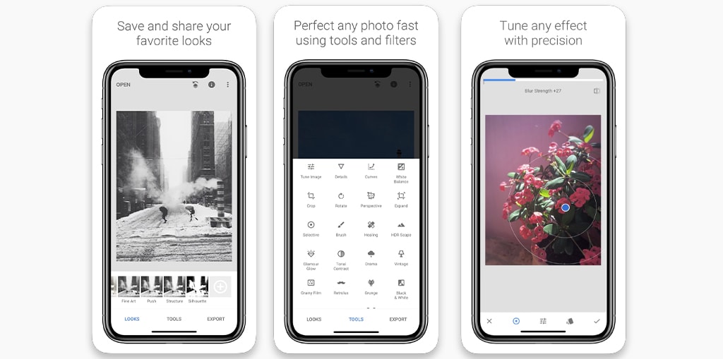App Snapseed của Google là 1 cái tên khá sở hữu 29 công cụ và bộ lọc: chỉnh sửa, cắt xén, dựng thẳng ảnh, thêm khung, chèn chữ, vignette, bút vẽ, cấu trúc, HDR, phối cảnh, chọn vùng chỉnh sửa riêng,…